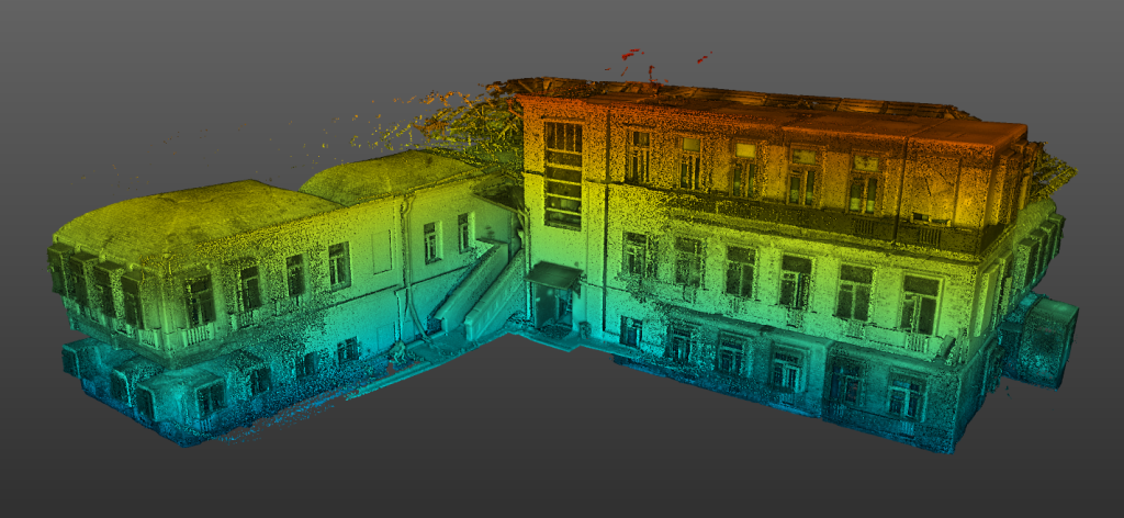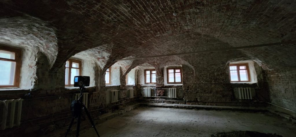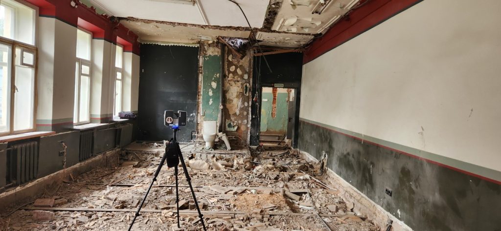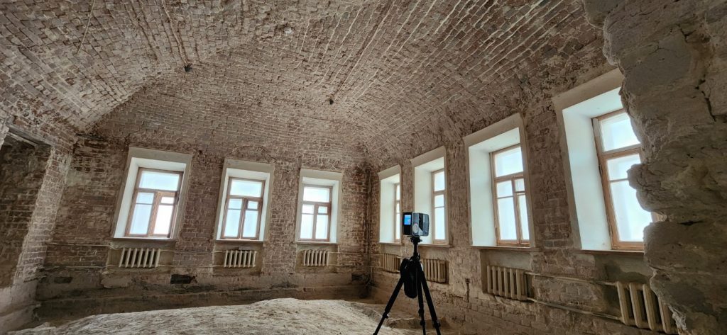 Лазерное сканирование помещений особняка в Кадашевском переулке в Москве. Ранее здесь располагался офис АБ Рождественка. Помещения переоборудуют. Строительным работам предшествует демонтаж и лазерное сканирование.